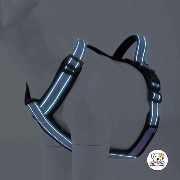 Walk your dog with confidence and comfort using the Eco Pet Supply Pet Open Knot and No Pull Dog Harness – Adjustable Chest Strap with Reflective Strips